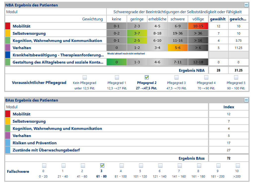 Die Module decken sich inhaltlich und hinsichtlich ihrer Punktwertabstufung mit den ersten vier Modulen des Neuen Begutachtungs-Assessments (NBA) des Medizinischen Dienstes, was eine Prognose des voraussichtlichen Pflegegrades ermöglicht. Sie wurden darüber hinaus gezielt um wichtige Informationsbausteine, wie beispielsweise Sturzhistorie, erweitert. Mit den Modulen fünf und sechs werden potenzielle Risiken und Überwachungsbedarfe identifiziert. Entsprechend dem pflegefachlichen Urteil wird durch das Befüllen des BAss ein Punktwert ermittelt („BAss-Nursing-Case-Index“).