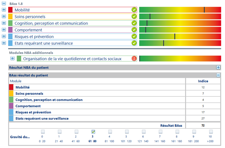 Tous les items de la BAss sont structurés et disposent d’un système de codage et d’évaluation. Ainsi, la BAss permet de déduire des scores pertinents, utiles pour l’assurance qualité, la planification du personnel et la gestion des soins. Calculé directement à partir de la documentation BAss, le « BAss Nursing Case Index » regroupe les bénéficiaires de soins en dix degrés de gravité de cas, en fonction de leur complexité en matière de soins. Ainsi, la gravité de cas d’une personne à soigner est déterminée presque comme par magie – au profit de la gestion des cas de soins.